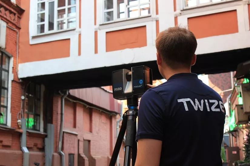 Команда провела рекогносцировку и с помощью высокоточного 3D‑сканера FARO Focus Premium создала геодезическую сеть для привязки результатов работы — поскольку доступ к объекту был ограничен и нужно было убедиться, что облако точек и исходные данные «сядут» точно, без ошибок. Эксперты TWIZE зафиксировали текущее состояние здания с точностью до миллиметра и объединили данные сканирования фасадов, интерьеров и кровли в единую модель.