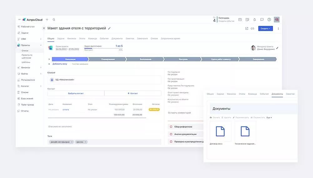 - Документы и история взаимодействий всегда под рукой. Раньше поиск нужного договора или технического задания мог занимать много времени. Сейчас они хранятся в карточке проекта, а менеджеры видят историю всех контактов с клиентом без лишних запросов