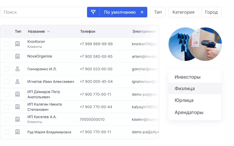 Карточка клиента объединяет контакты, историю взаимодействий, документы и предпочтения. Менеджер видит полную информацию даже при повторном обращении клиента или смене объекта сделки. При работе с юридическими лицами можно объединять контакты сотрудников в карточку компании.