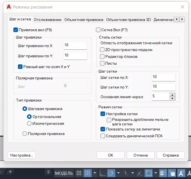 - Настройте шаг привязки: щёлкните правой кнопкой мыши по кнопке «SNAP» на панели состояния и выберите «Настройка...». В диалоговом окне «Режимы рисования» задайте нужное значение в поле «Шаг привязки» (например, 100 мм)