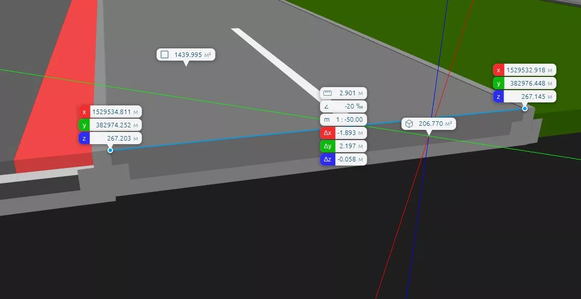 Имеется функционал для выполнения измерений длины, уклона, площади, объема, координат и высотных отметок (Рис. 12).