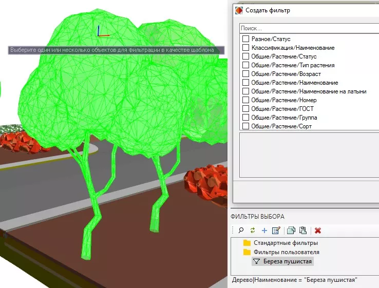 При этом операторы при построении фильтров используются такие же, как при работе с базой данных SQL. В первом случае (формула 1) будут найдены деревья с наименованием «Береза пушистая», во втором случае (формула 2) — все со словом «Береза» в наименовании, а в третьем случае (формула 3) — все элементы деревьев в независимости от наименования.