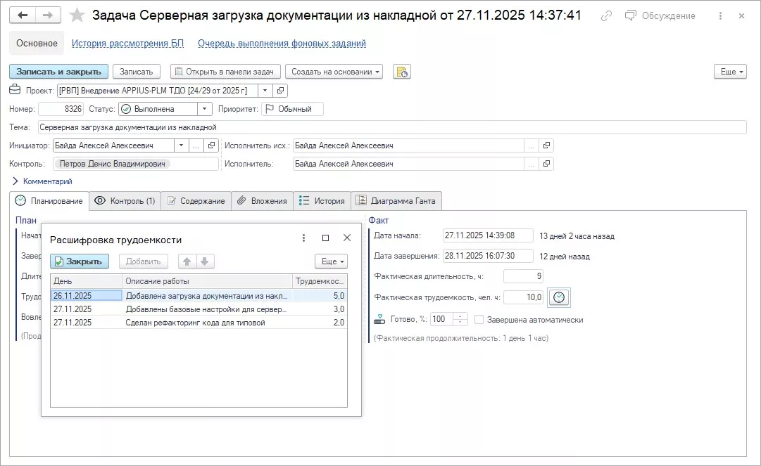 Появилась удобная функция расшифровки трудоемкости задач. Теперь исполнители задач могут вносить описание фактической трудоёмкости выполнения задачи.