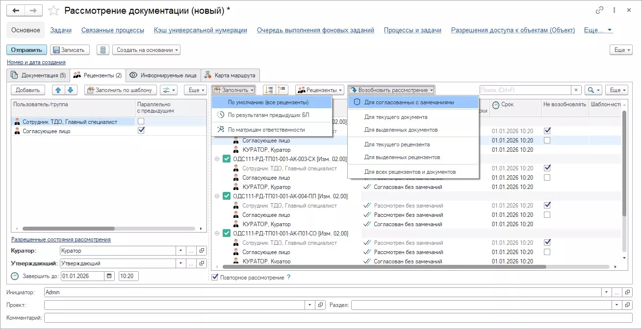 В текущем обновлении выполнен ряд доработок, направленных на улучшение бизнес-процесса рассмотрения документации. Одной из ключевых новинок стала интеграция закладки «Дерево согласования» с формой «Рецензенты», что позволило сделать интерфейс удобнее и быстрее ориентироваться в структуре согласующих лиц.