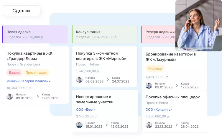 Основная задача программы управления клиентами для застройщиков — облегчить продажу недвижимости. CRM помогает превратить потенциального покупателя в реального клиента, упрощает контроль всех этапов сделки и взаимодействие с командой. С ее помощью менеджеры видят всю историю контактов, документы и задачи в одном окне, а руководитель — прозрачную аналитику работы отдела продаж.