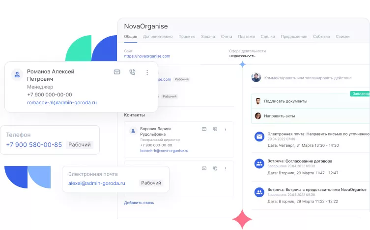 Карточка клиента объединяет контакты, историю взаимодействий, документы и предпочтения. Менеджер видит полную информацию даже при повторном обращении клиента или смене объекта сделки. При работе с юридическими лицами можно объединять контакты сотрудников в карточку компании.