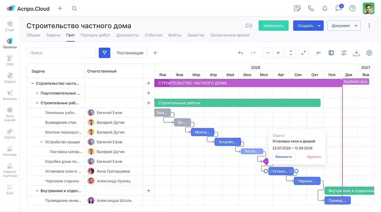 - Отслеживать этапы строительства и сдачи в эксплуатацию через диаграммы Ганта