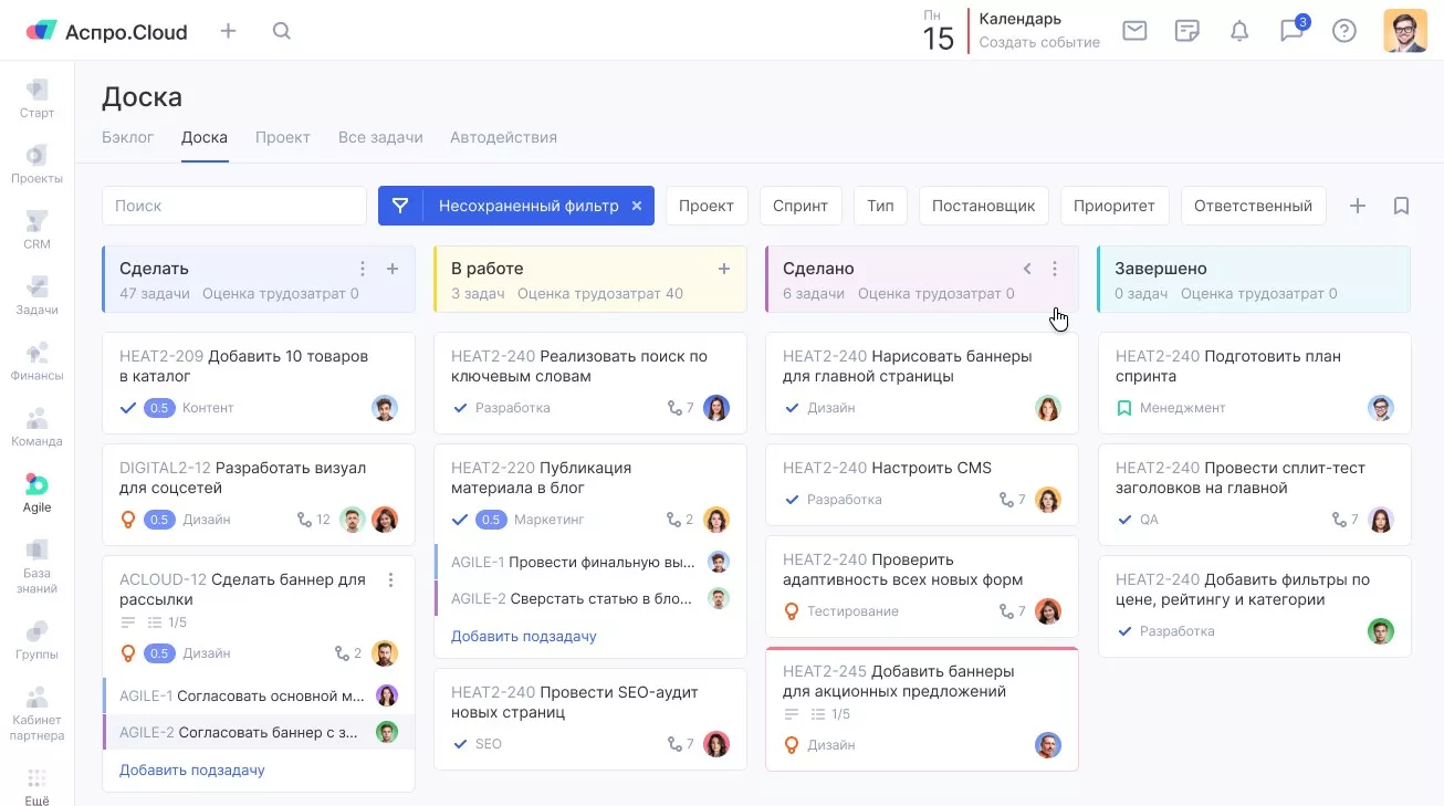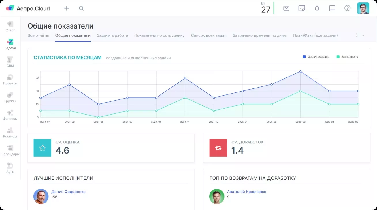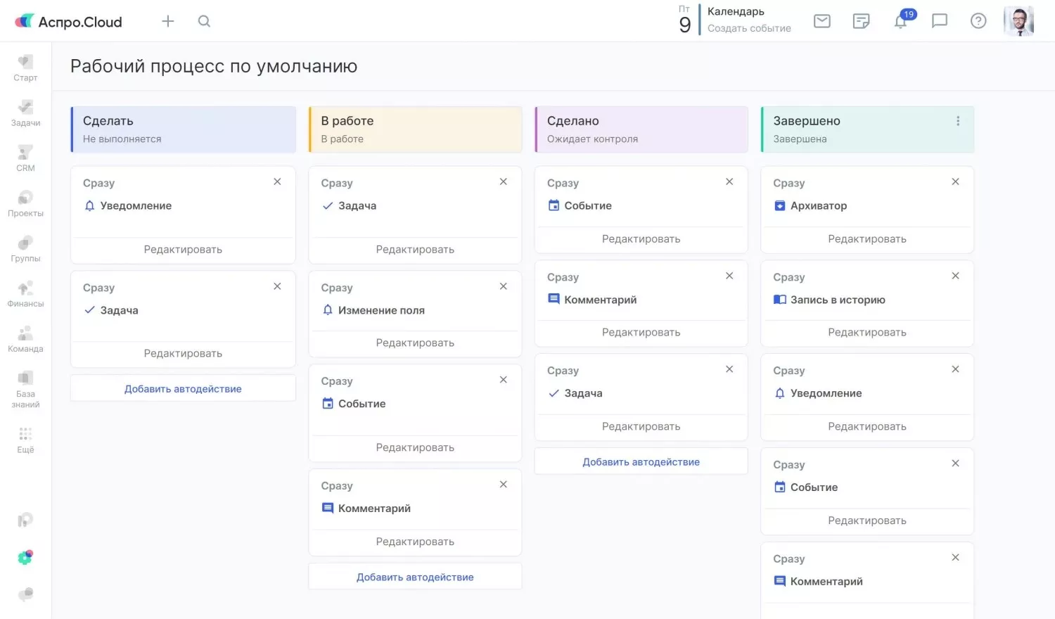 Аспро.Cloud дополняет канбан управленческим уровнем: задачами, объединенными в проекты, общей доской для руководителя, гибкой настройкой этапов, автодействиями и отчетами.