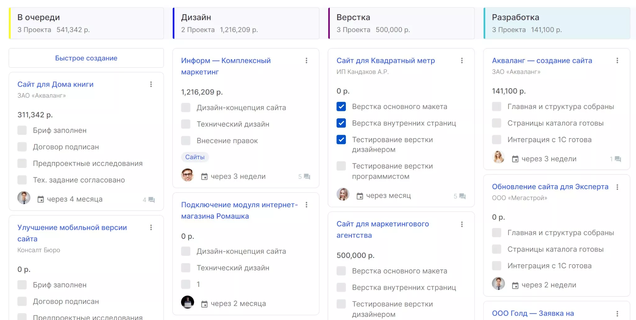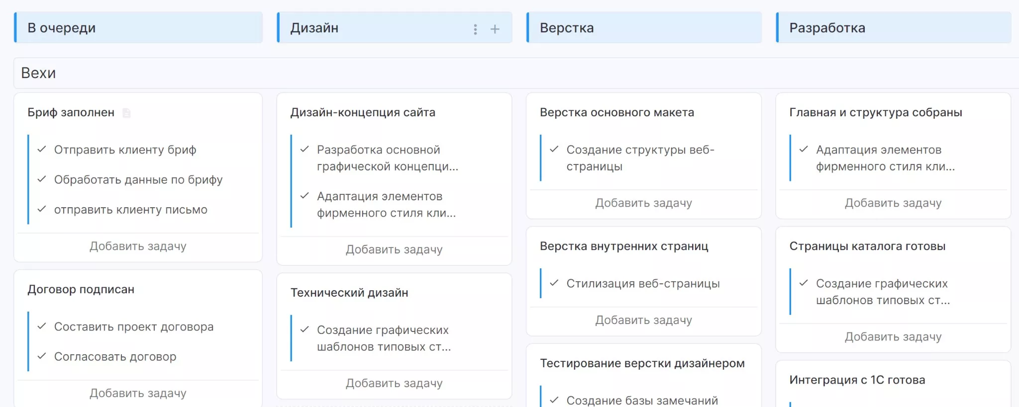 Статусы на канбан-доске можно настраивать под конкретный бизнес-процесс. Для проектной компании это могут быть: