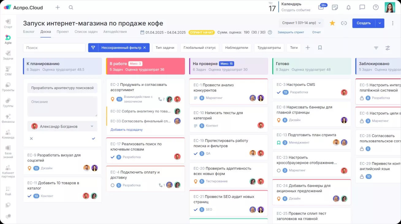 В CRM-системе Аспро.Cloud вся работа Planoplan строится вокруг проектов. На канбан-доске отображаются задачи сотрудников текущего спринта, и сразу понятно, на каком этапе находится каждая задача.