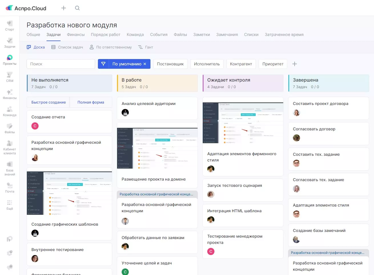 При этом в Аспро.Cloud есть общая канбан-доска, где руководитель видит задачи по всем проектам. Это удобно, когда нужно оценить общую картину: кто перегружен, какие этапы тормозят, сколько задач находится на согласовании.