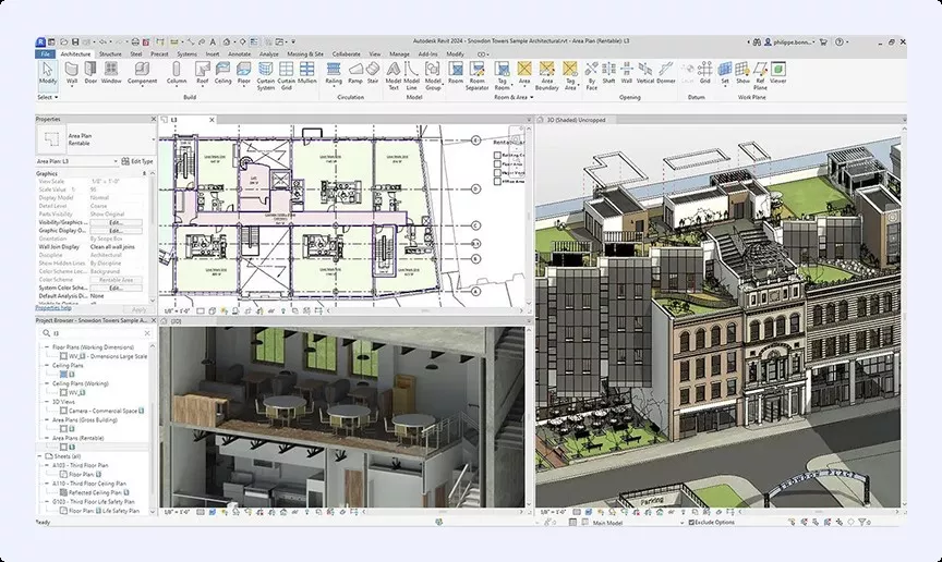 Главный инструмент для архитекторов, инженеров и конструкторов. Работает с параметрическими элементами: если специалист меняет один объект, система автоматически обновляет связанные чертежи и спецификации. Это снижает количество ручных ошибок и экономит недели работы. На больших проектах, где десятки инженерных систем связаны между собой, такая автоматизация критически важна.