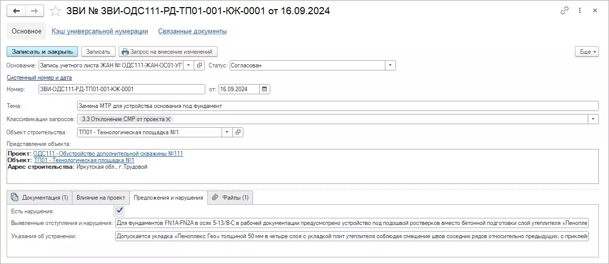 Дополнительно в составе модуля предусмотрена печатная форма запроса на изменение, облегчающая документальное оформление процедуры. Для быстрого перехода от документа к запросам в интерфейс «Дерево проектов» добавлена закладка «ЗВИ».